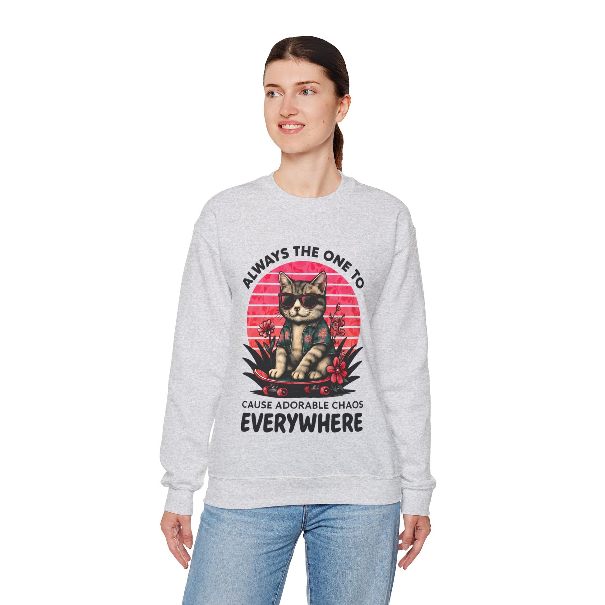 Always The One To Cause Adorable Chaos Everywhere - Vibrant Sunset Playful Cat on Skateboard Sweatshirt