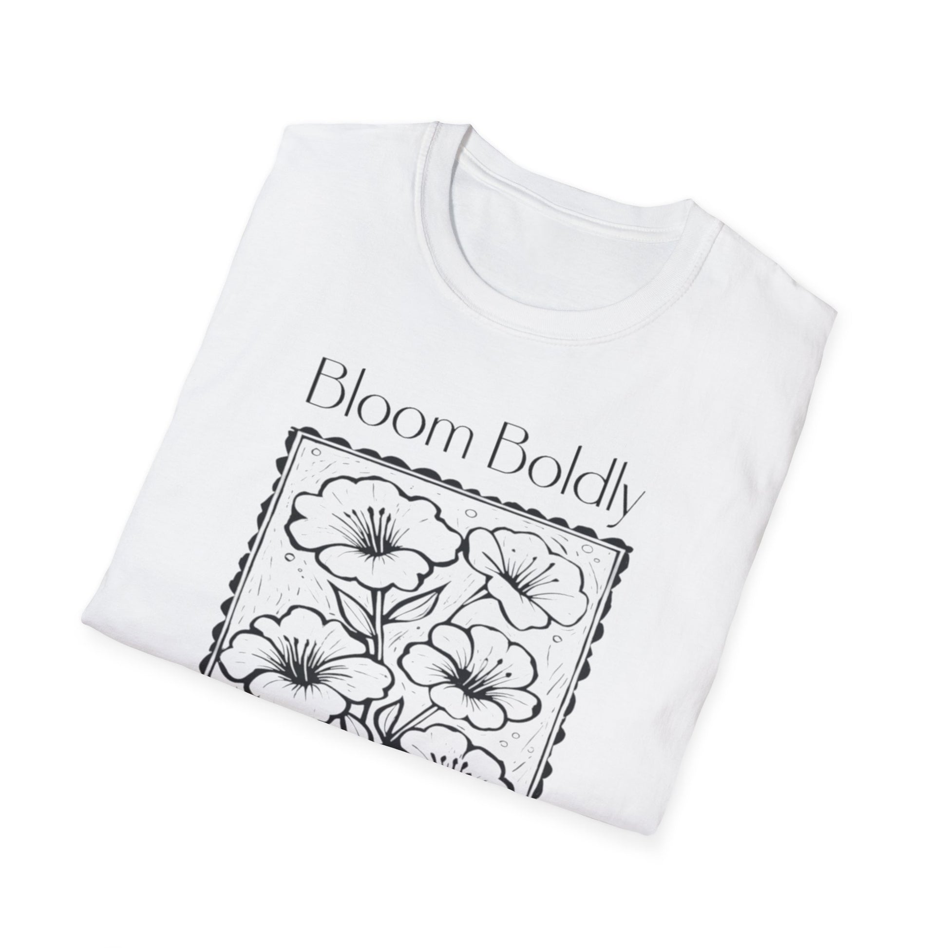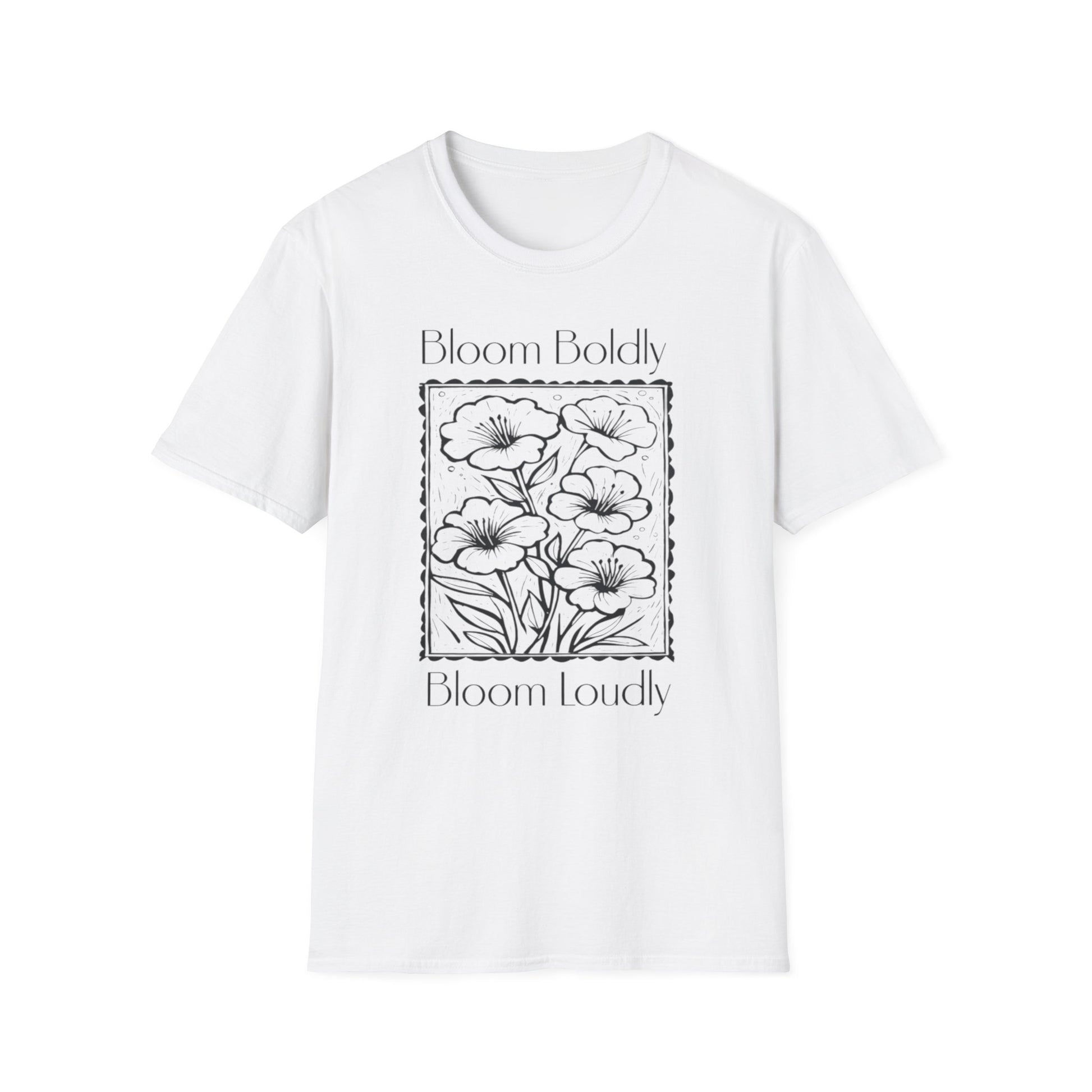 Bloom Boldly And Loudly - Monochrome Flowers With Stamp Border Linocut T-Shirt