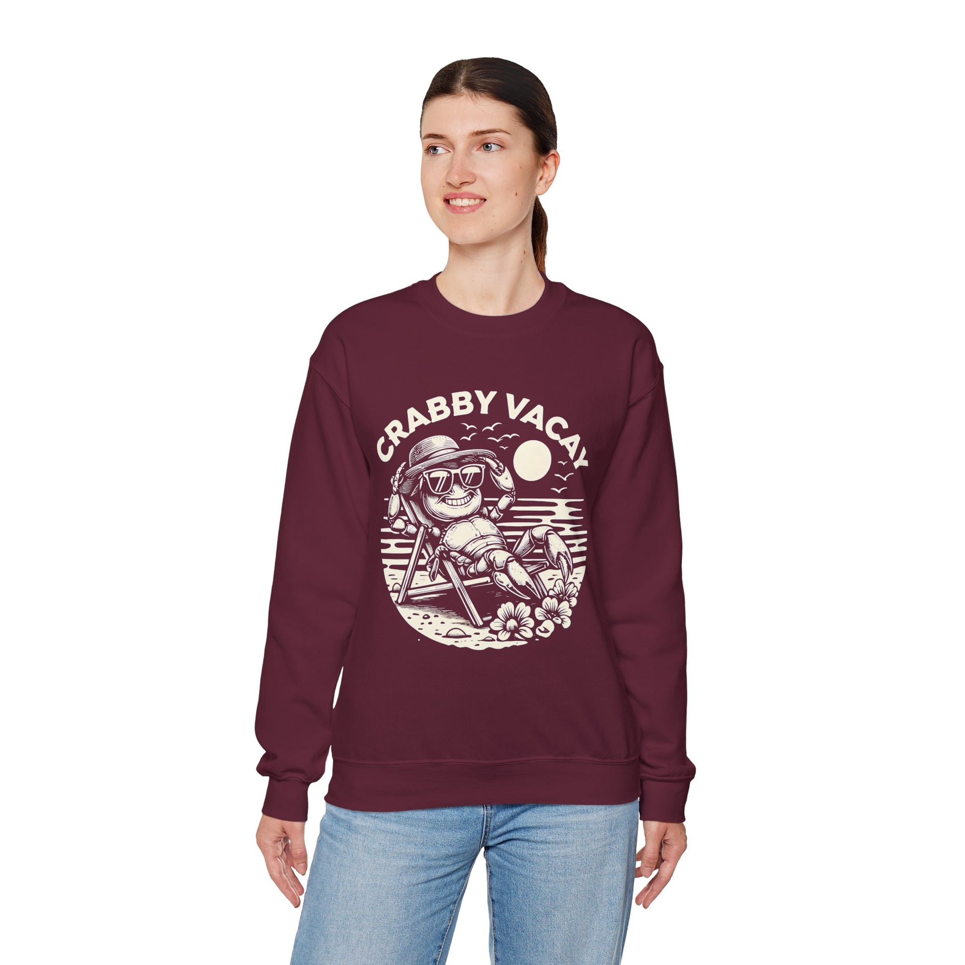 Crabby Vacay - Playful Monochrome Happy Crab Wearing Sunglasses in Tropical Scene Sweatshirt