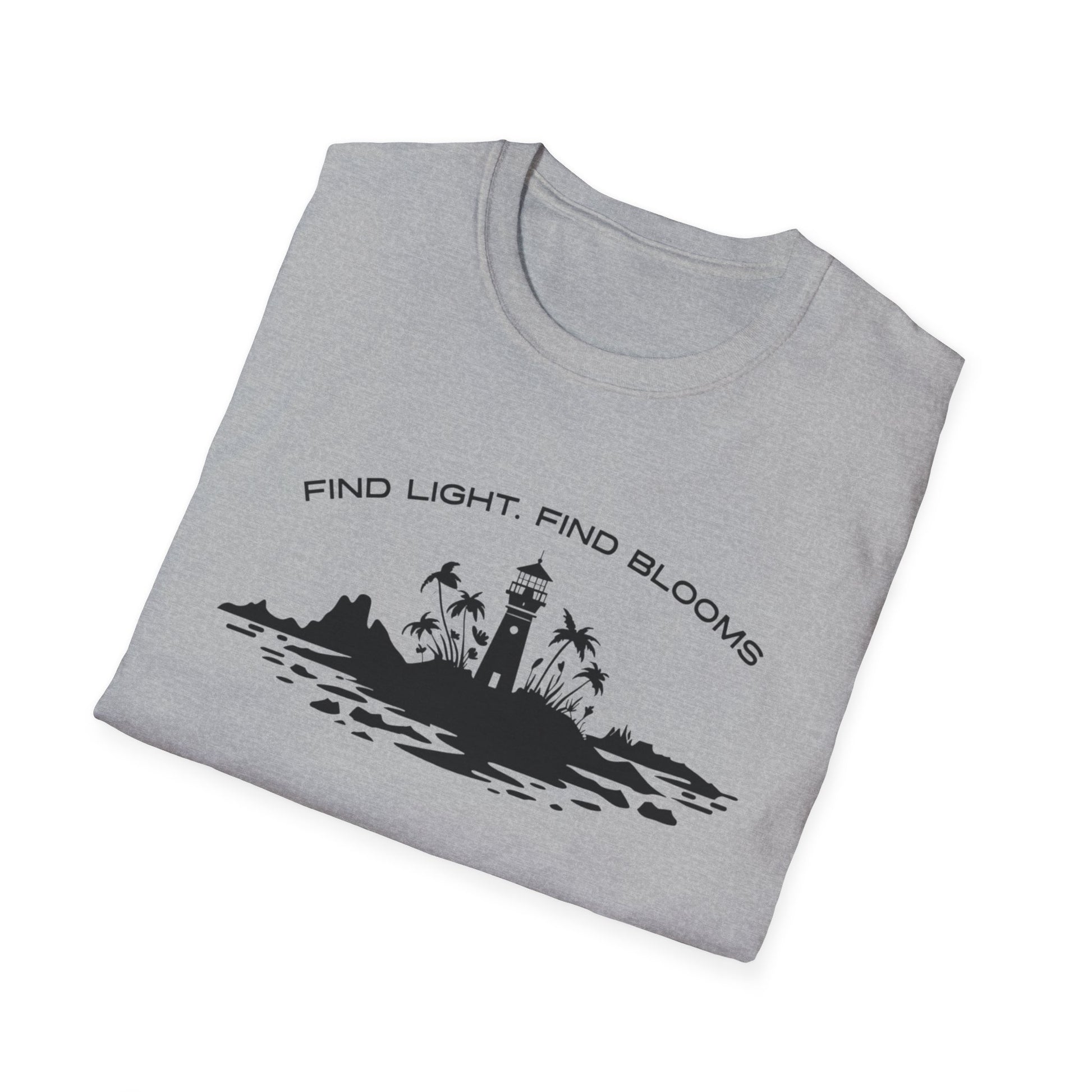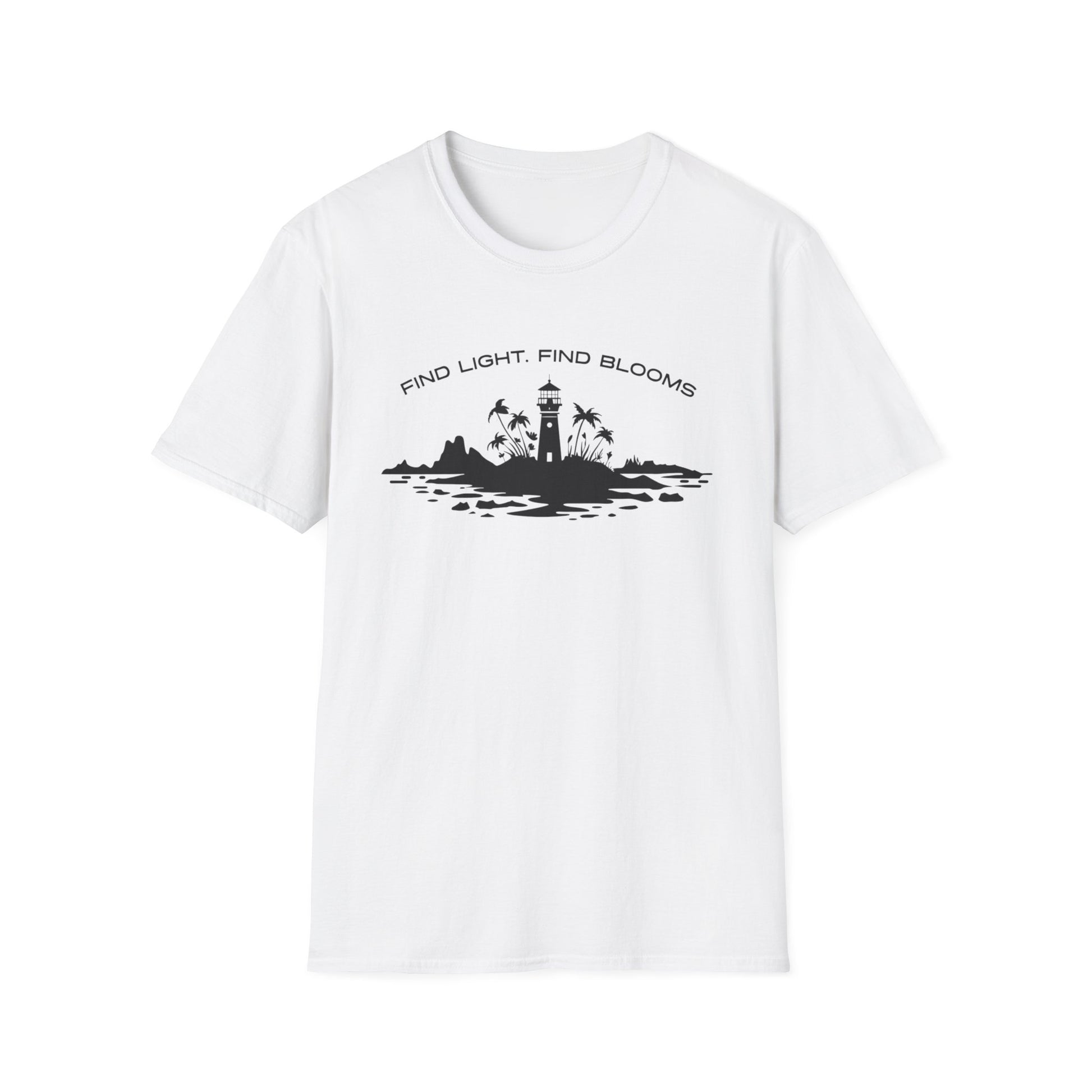 Find Light Find Blooms - Minimalistic Silhouette Lighthouse, Island, Palms and Florals T-Shirt