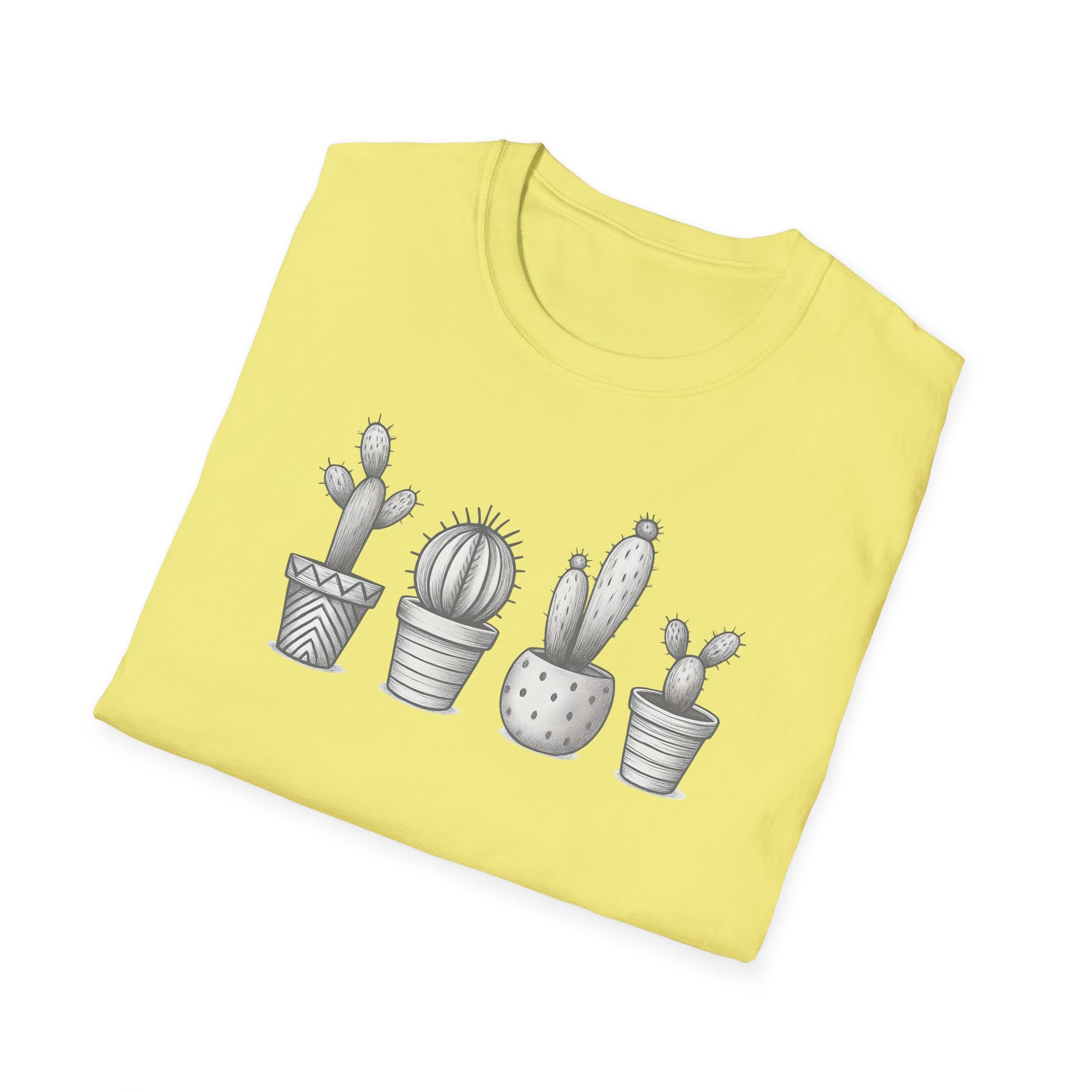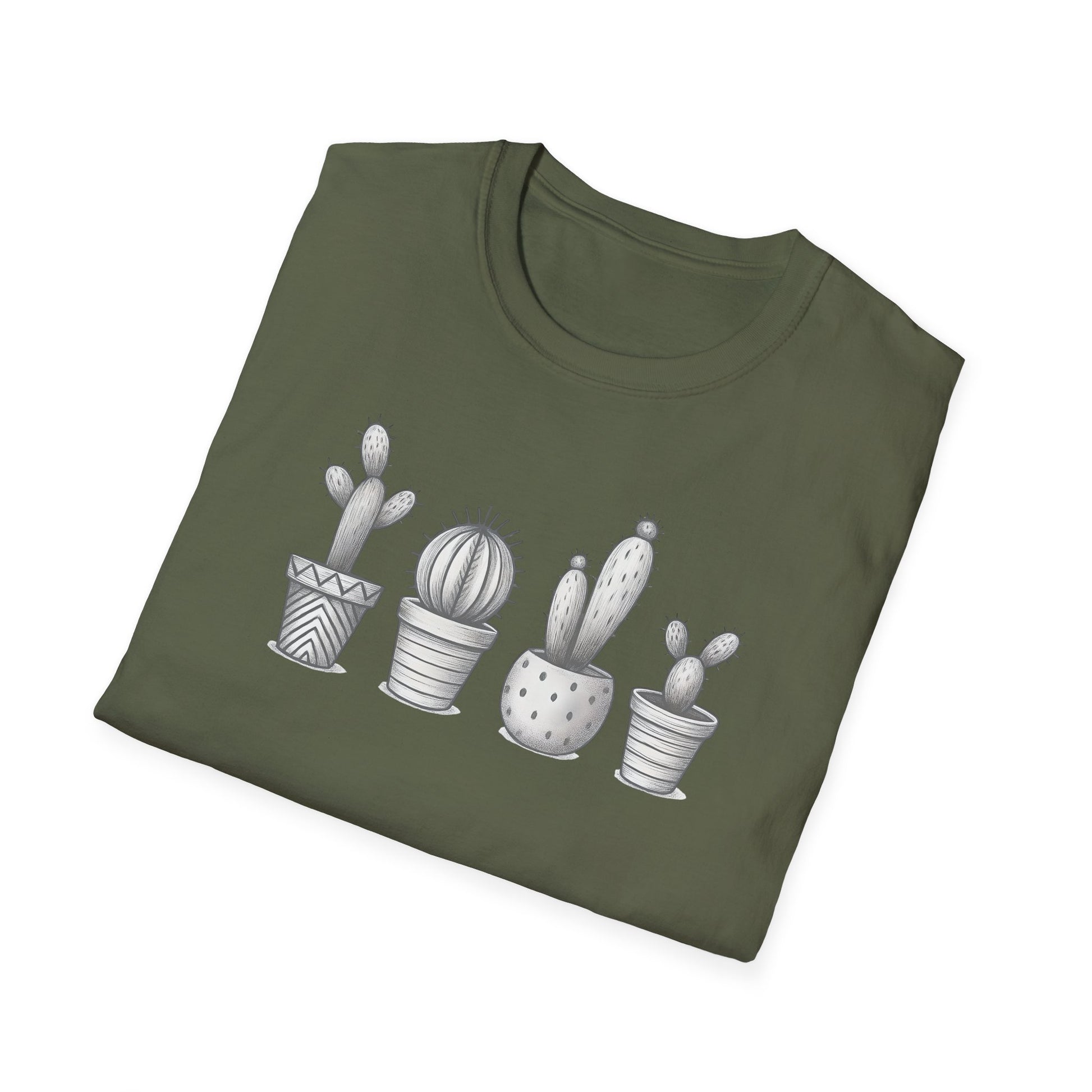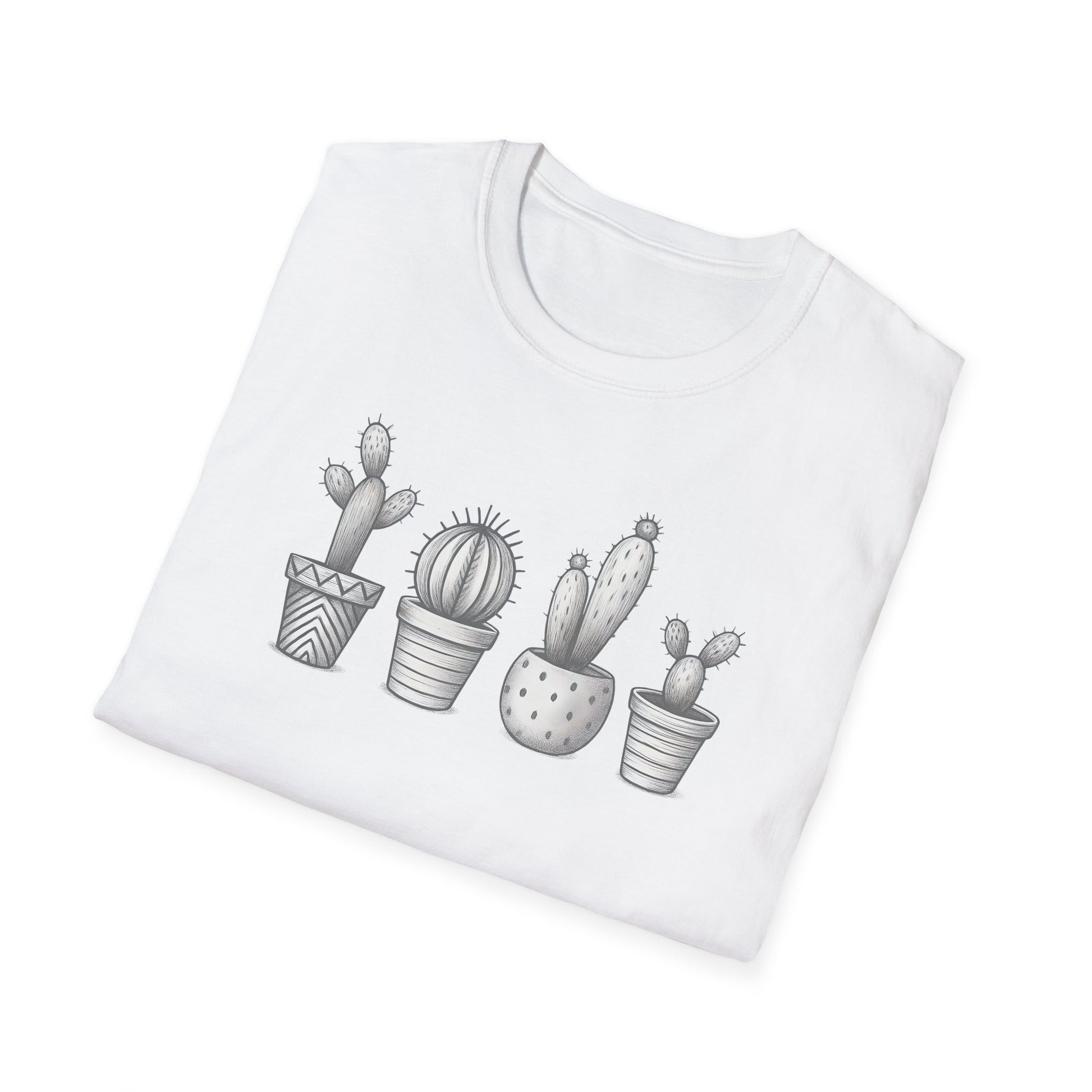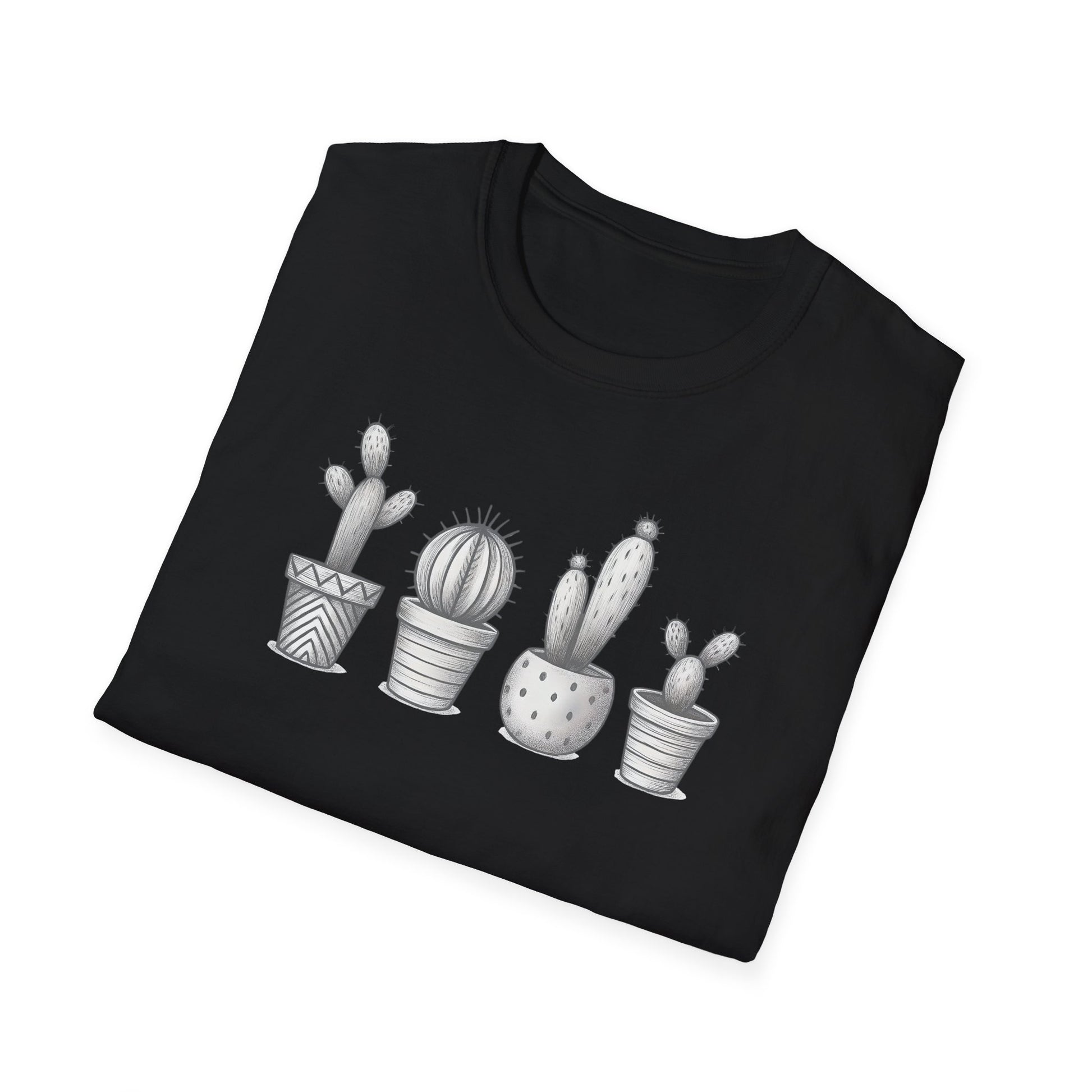 Gray Cacti In Terracotta Pots Line T-Shirt - Botanical Design