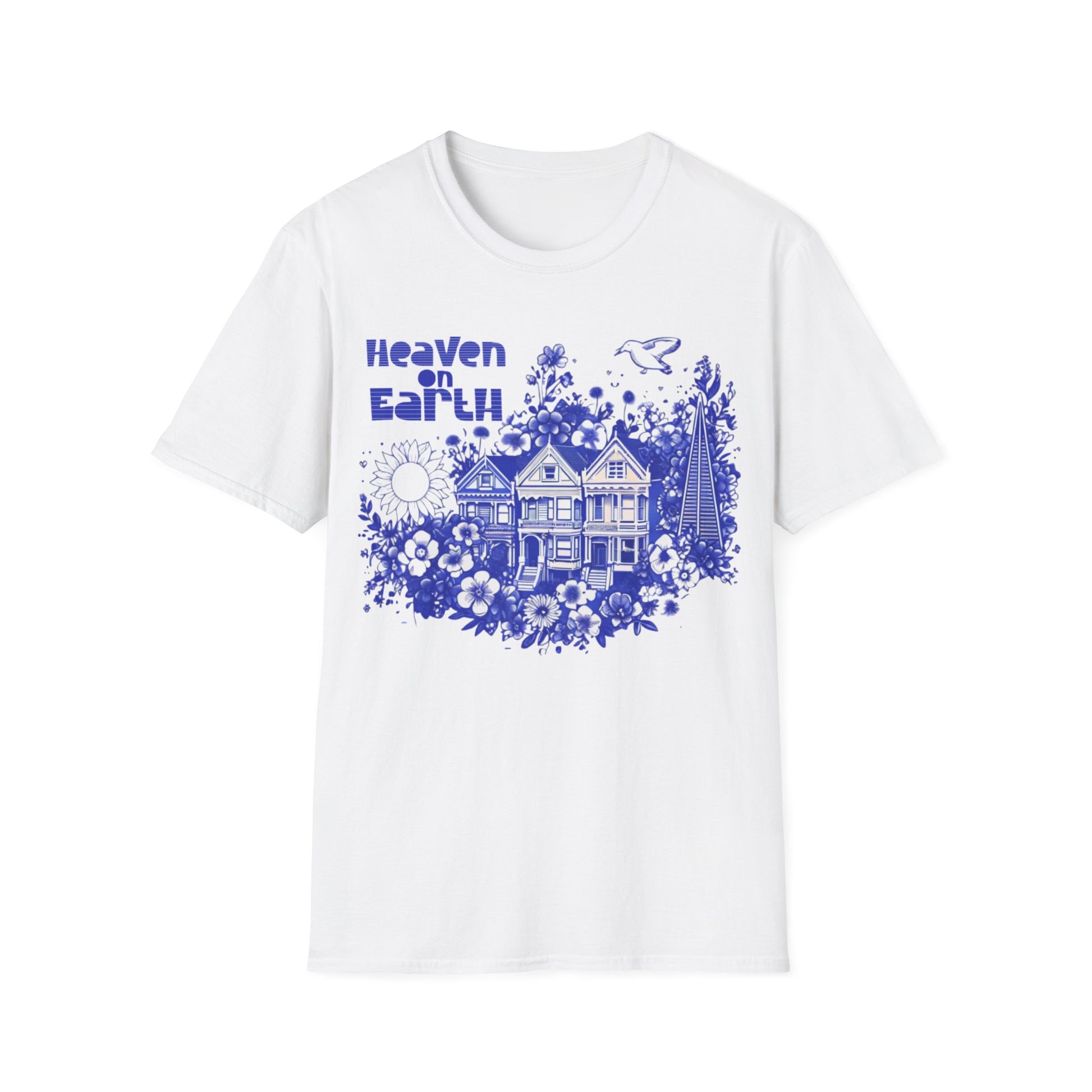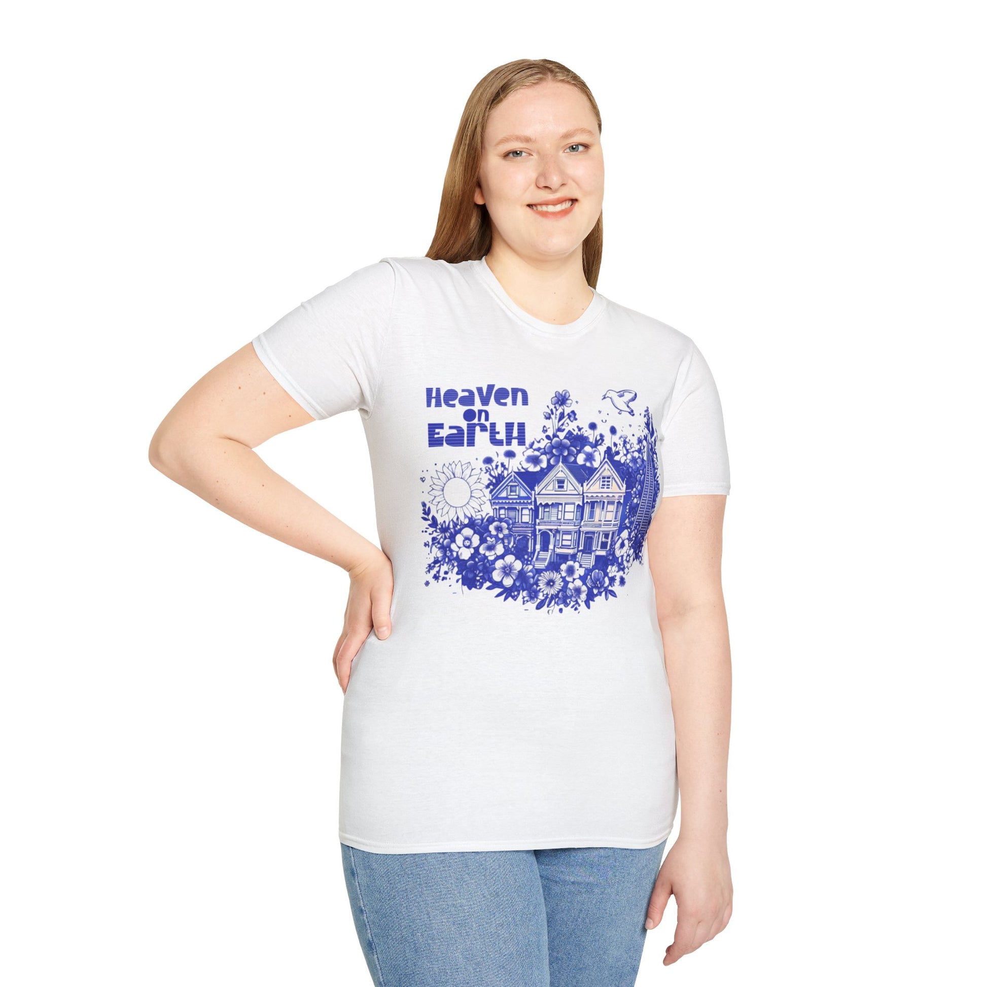 Heaven on Earth - Monochrome Blue Victorian House and Flowers T-Shirt