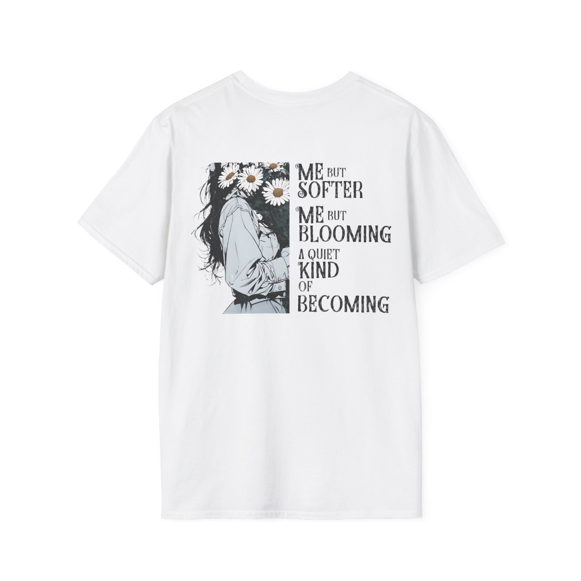 Me But Softer Me But Blooming Another A Quiet Kind of Becoming T-Shirt – Women Holding Daisy Flower Bouquet Typography Floral Pocket & Back Design