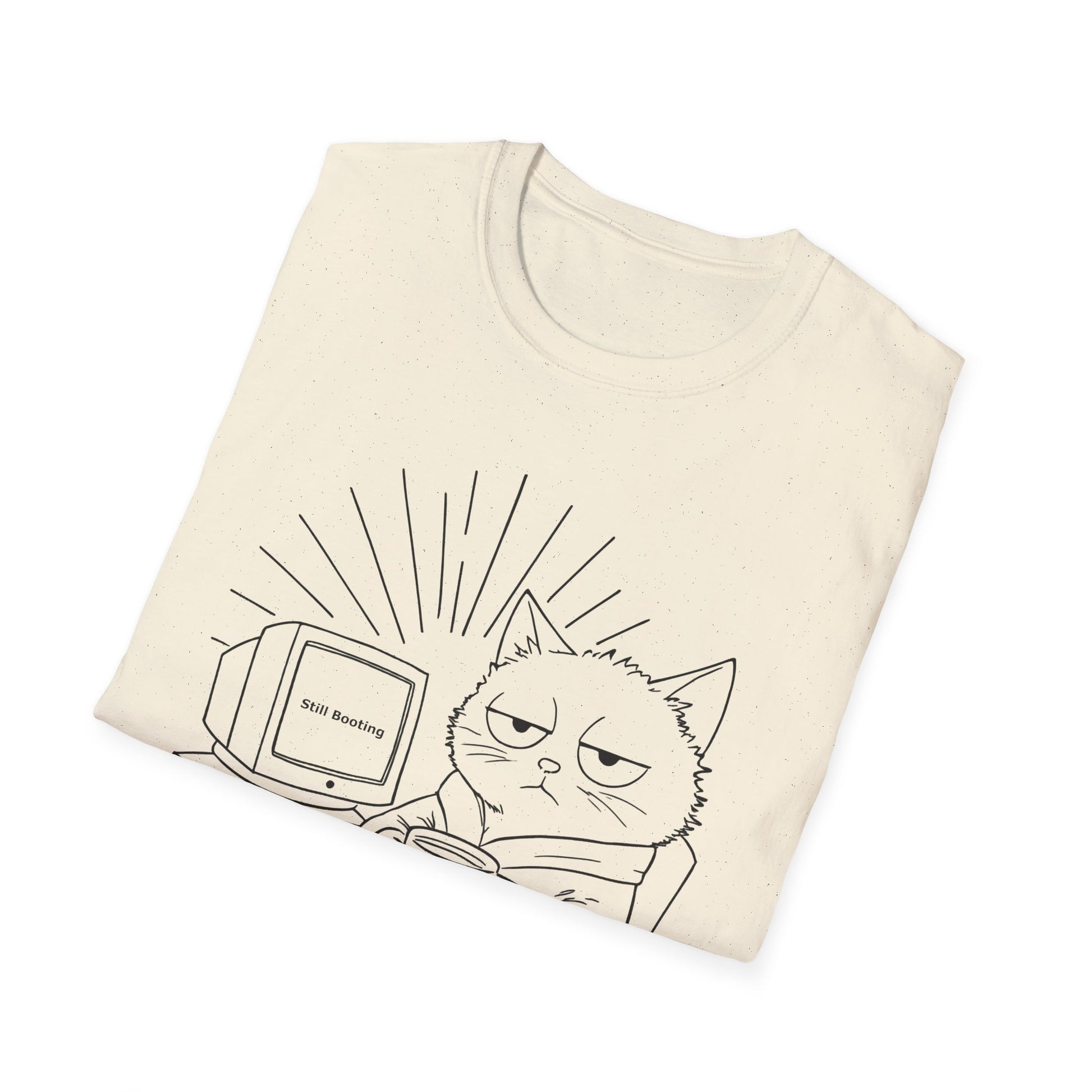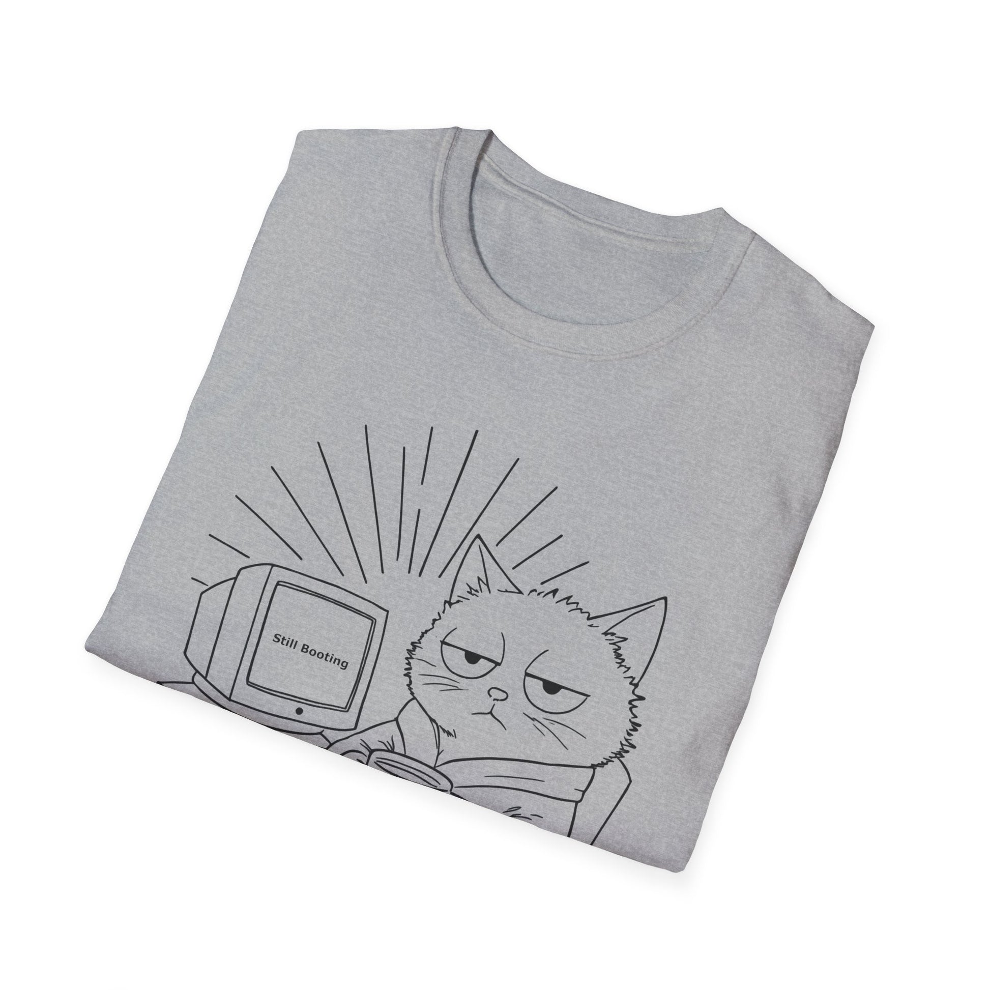 Not A Morning Cat Still Booting T-Shirt - Sleepy Cartoon Cat in Robe with Coffee Mug and A Computer In the Morning Design